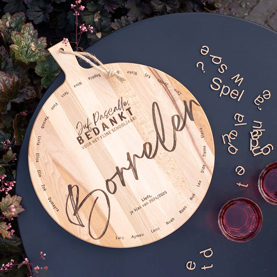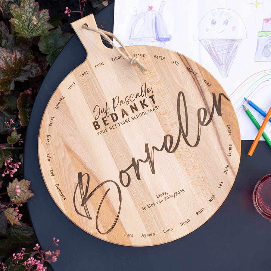 Op zoek naar een leuk cadeau om de juf of meester te bedanken voor het afgelopen schooljaar? Laat een borrelplank maken namens de klas! Rondom is er de mogelijkheid om de namen van de kinderen te laten graveren. Een super leuke herinnering aan het leuke schooljaar om bijvoorbeeld te geven met een juffen- en meesterdag.