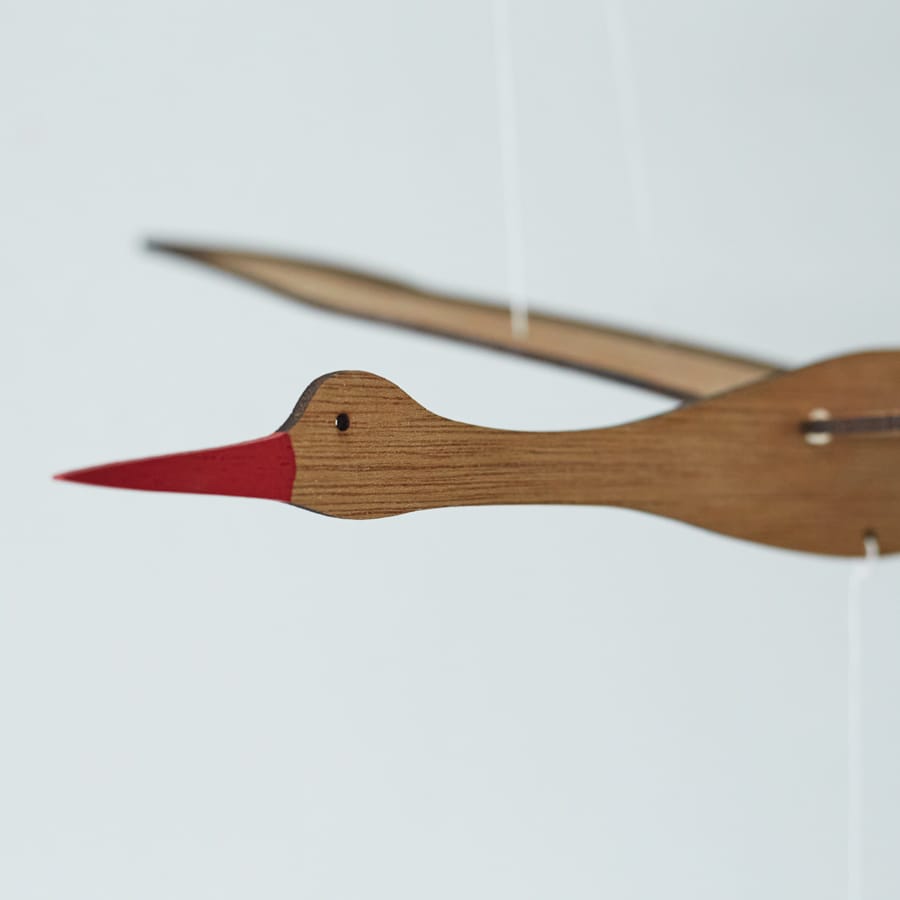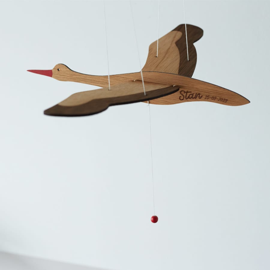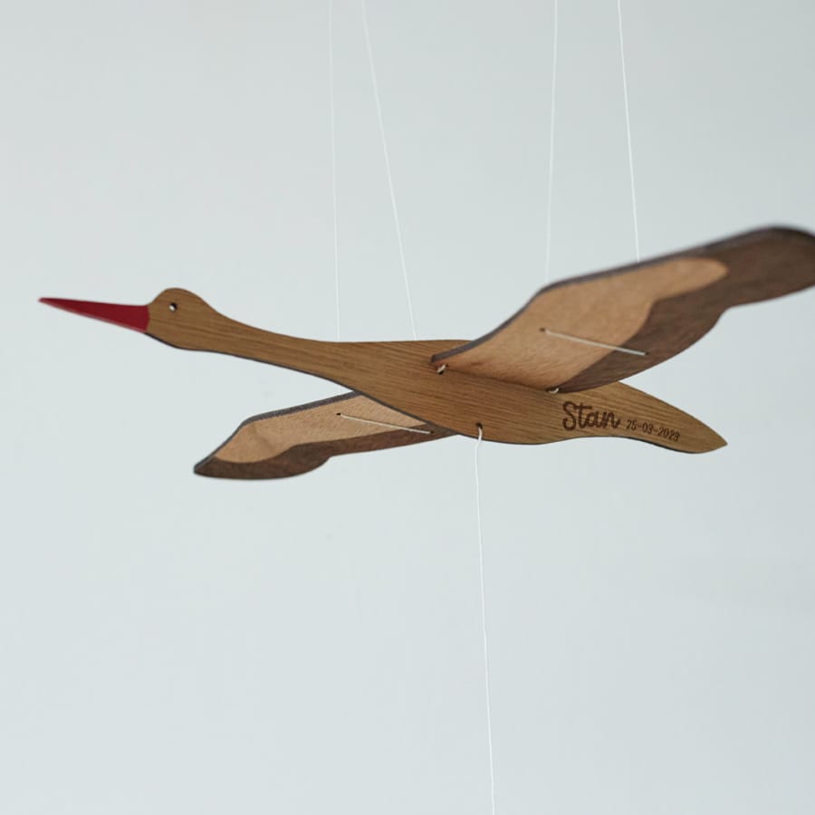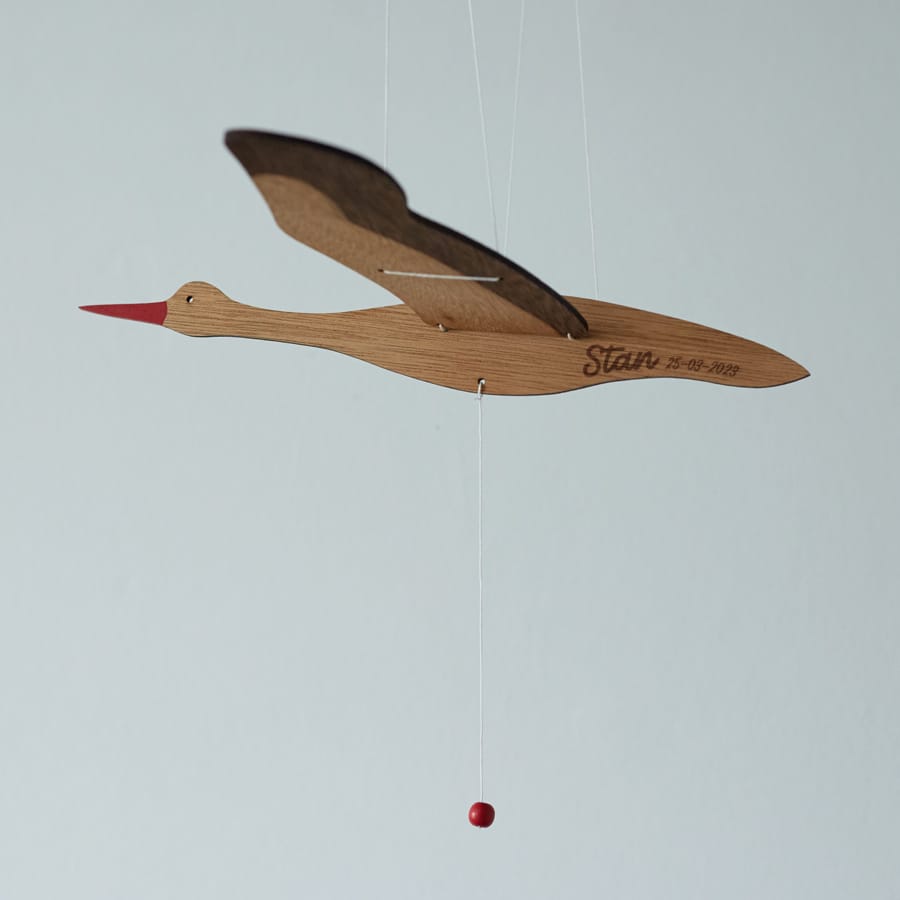 Een houten mobiel in de vorm van een ooievaar. Wanneer je aan het touwtje trekt zullen de vleugels bewegen, een leuk ritueel voor het slapen gaan!