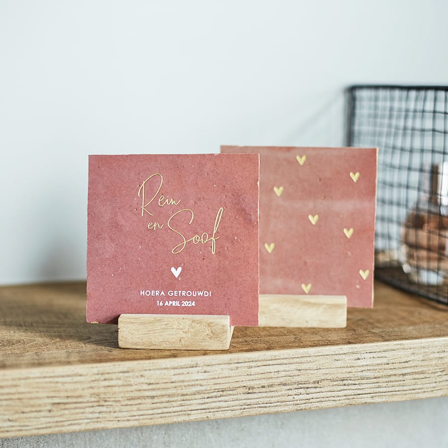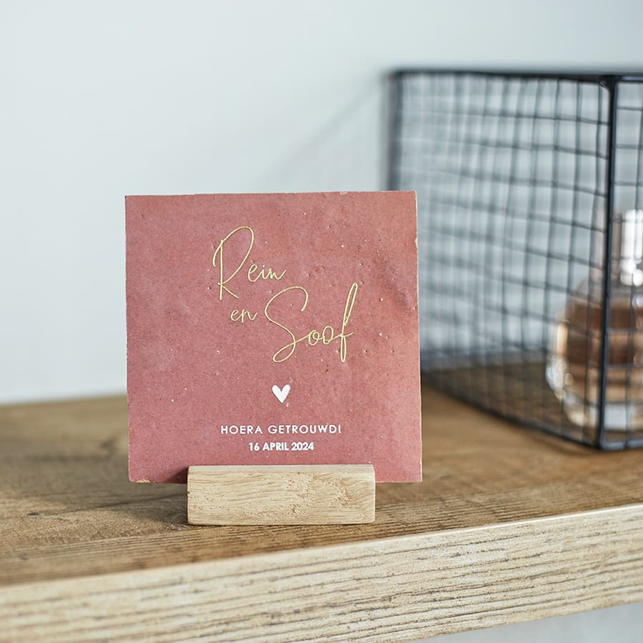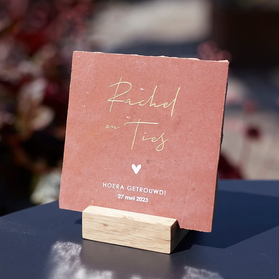 Verras het bruidspaar met een gepersonaliseerde trouwtegel.