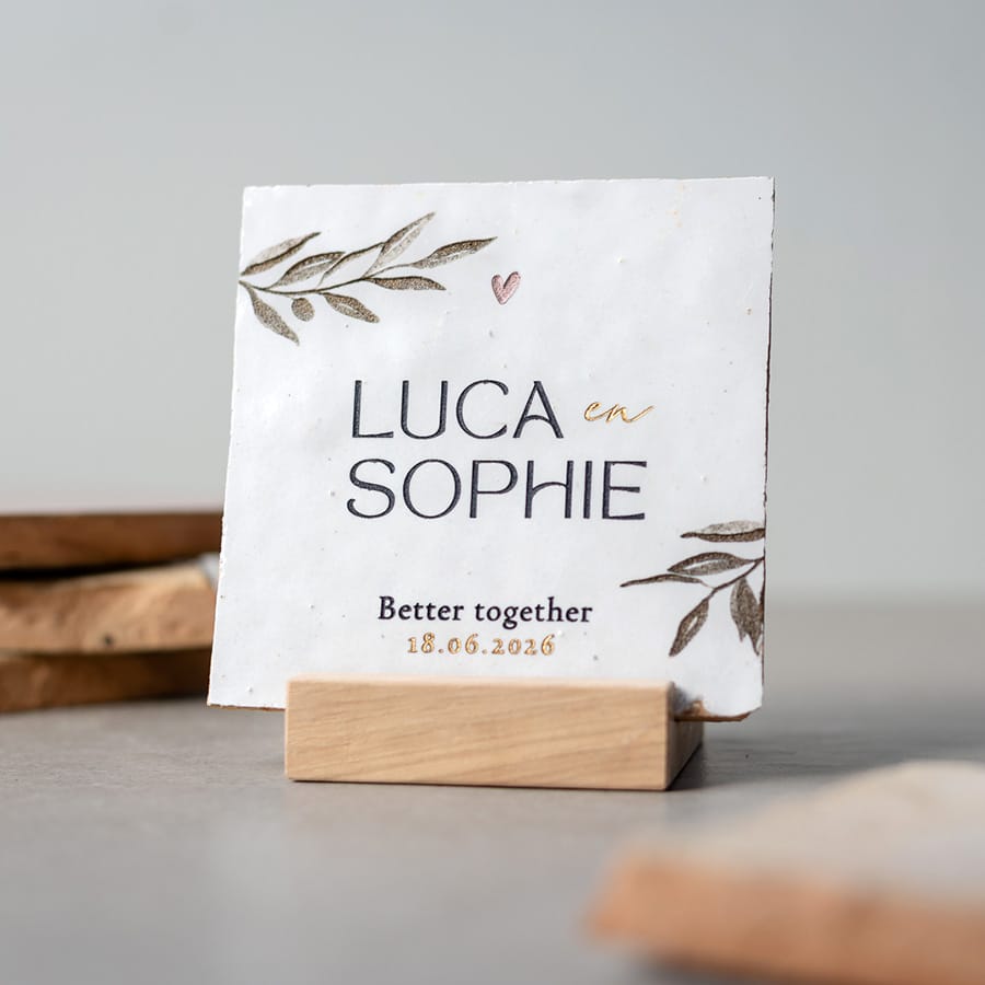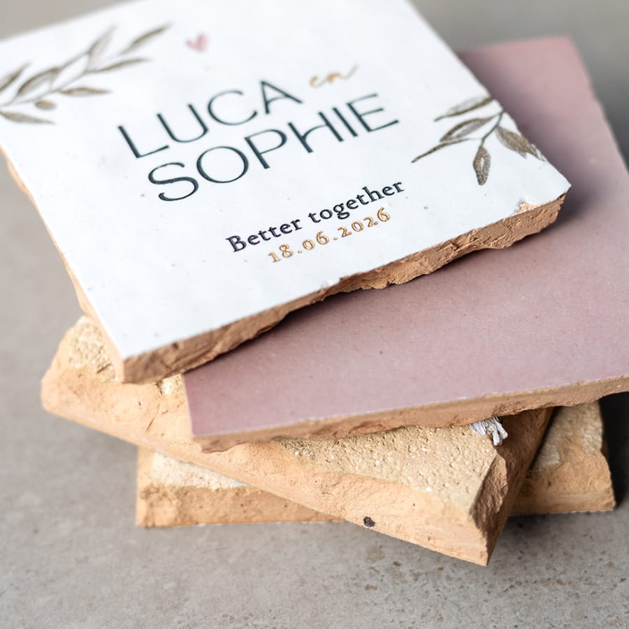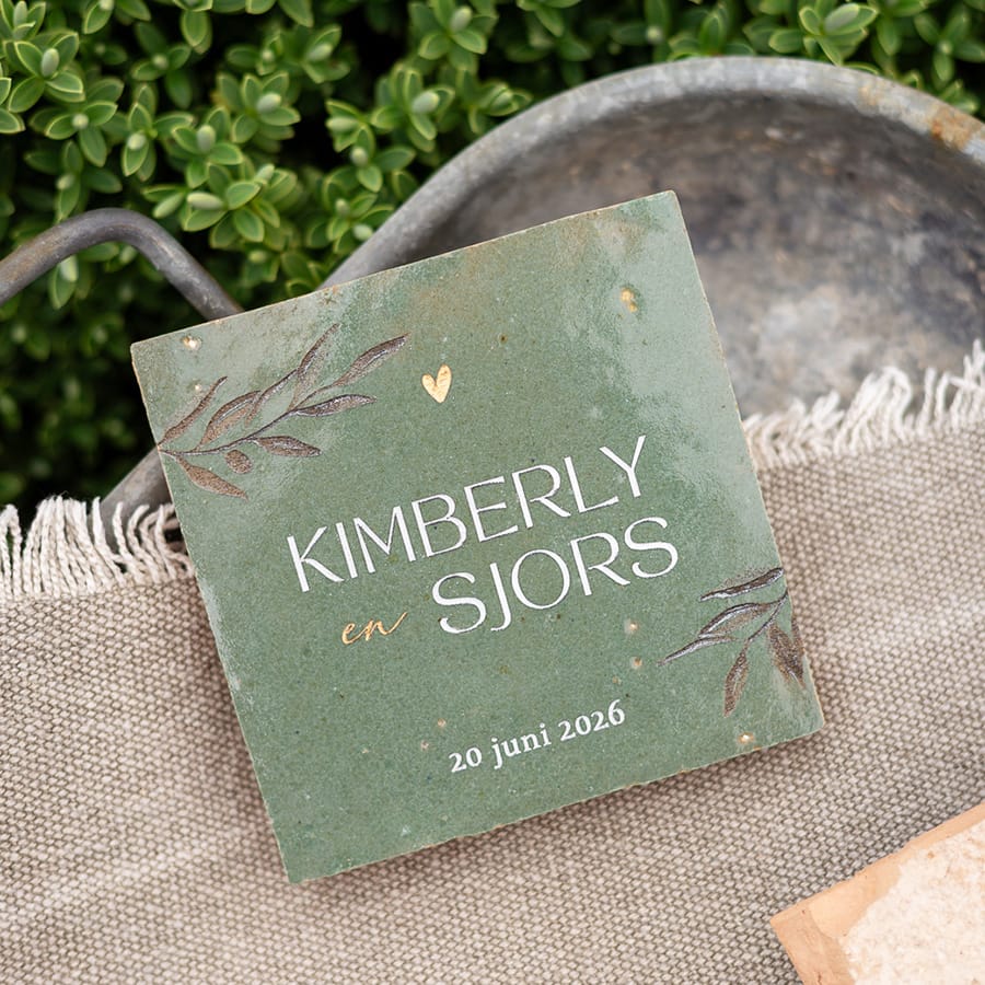 Deze gegraveerde trouwtegel met olijftakjes wordt speciaal gemaakt voor het bruidspaar. Een subtiel en stijlvol aandenken dat niet ergens verdwijnt, maar een vaste plek krijgt in huis.