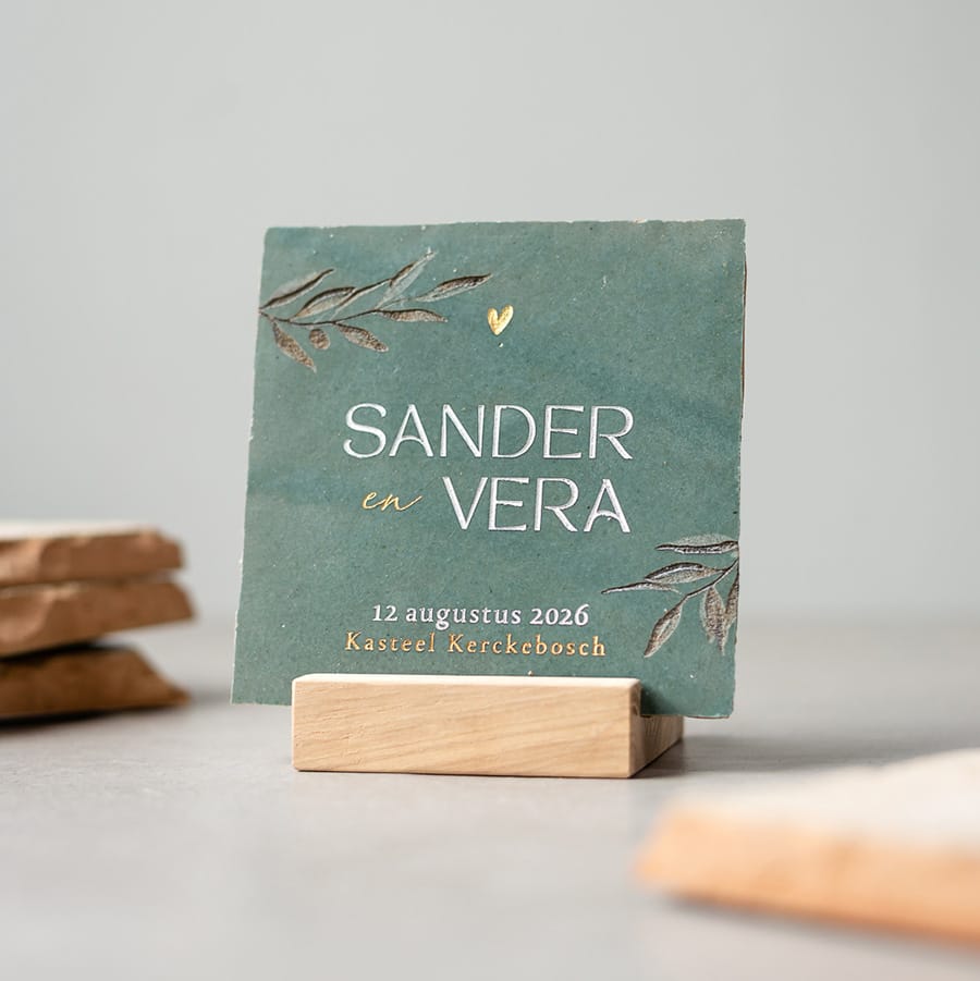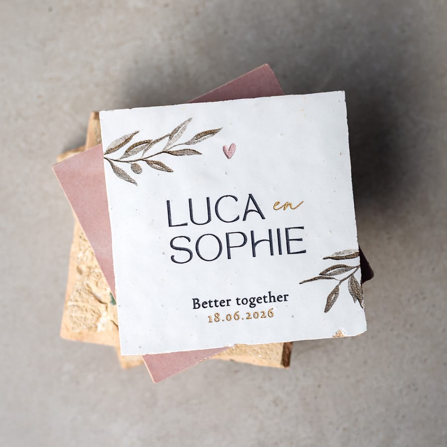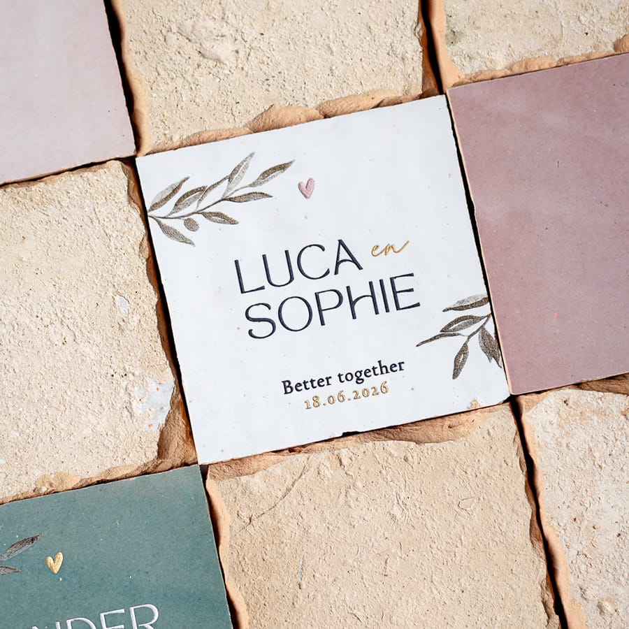 Gegraveerde trouwtegel met olijftakjes en namen Sophie en Luca, stapeltje handgemaakte zellingen