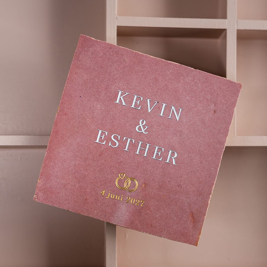 persoonlijk huwelijkscadeau gegraveerde trouwtegel met ringen roze met namen Kevin en Esther