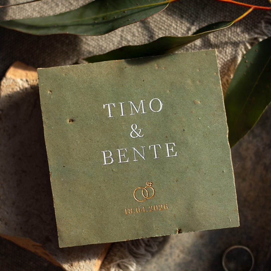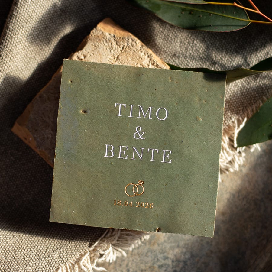 Detail verdiepte gravering, persoonlijke trouwtegel met ringen groen huwelijkscadeau met namen Timo en Bente