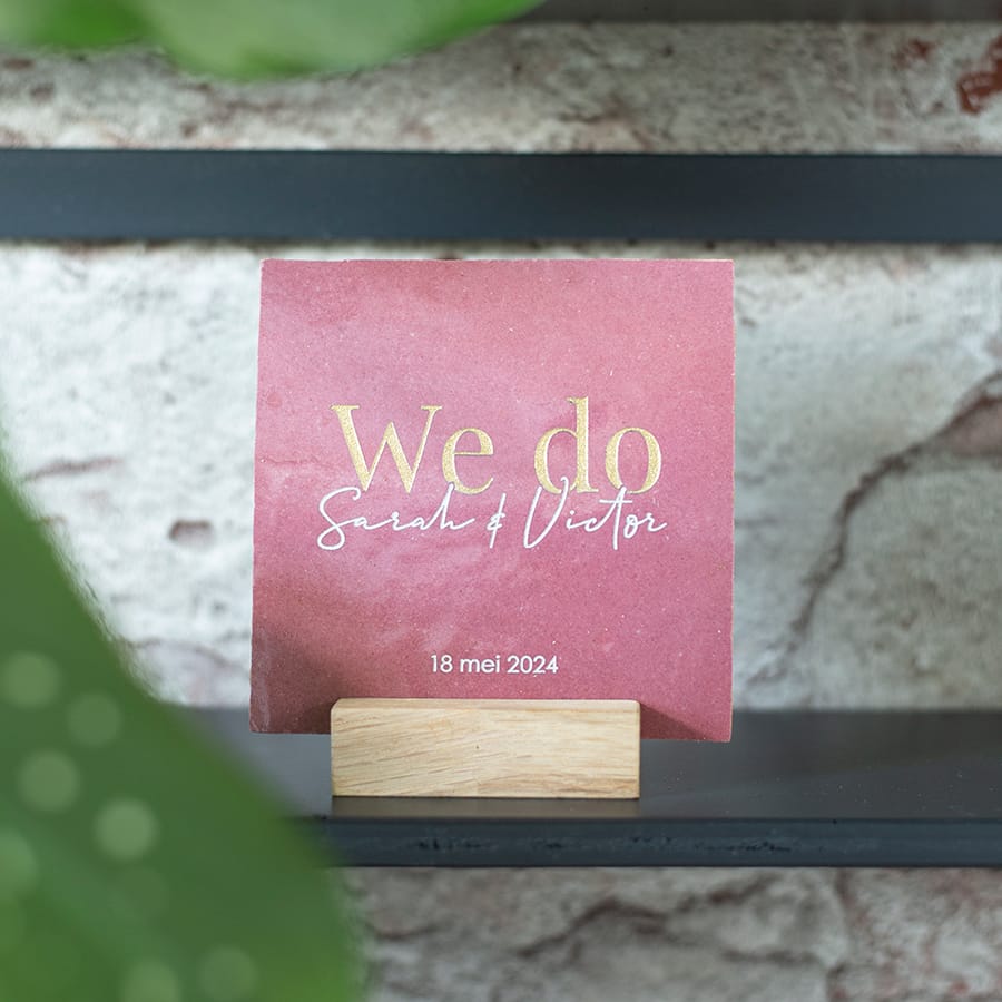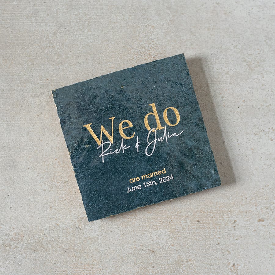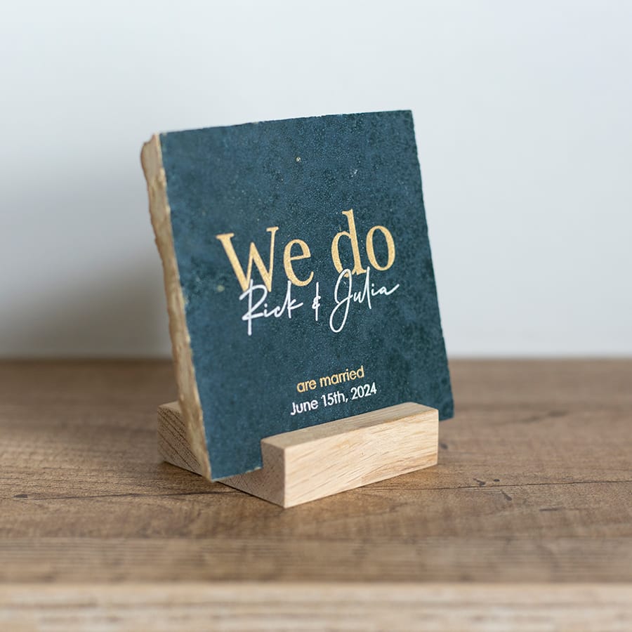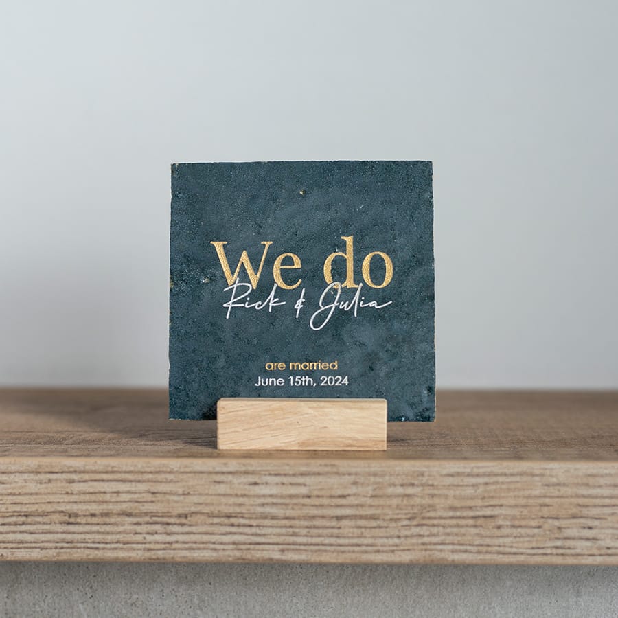 We Do! Verras het bruidspaar met een gepersonaliseerde trouwtegel.