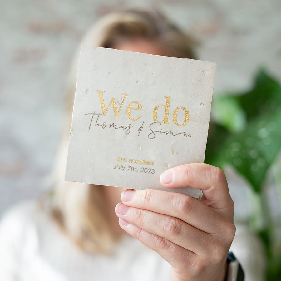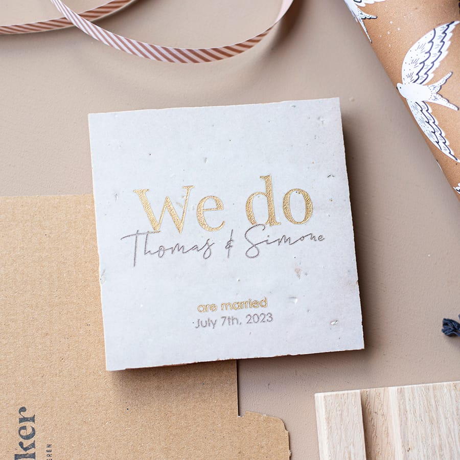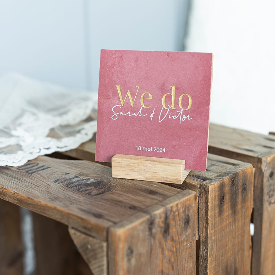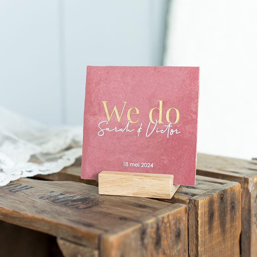 We Do! Verras het bruidspaar met een gepersonaliseerde trouwtegel.